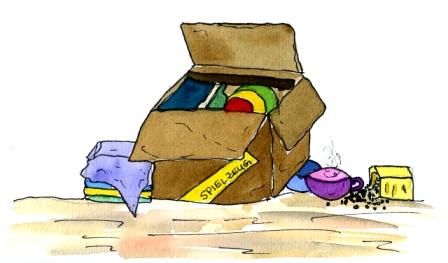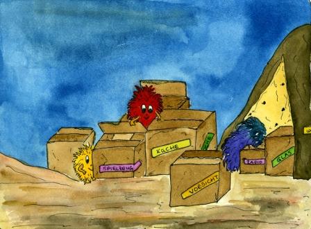 „Oh“, rief Quaddl da auf einmal. „Wir ziehen heute in die Seerosenbucht um.“ Überall standen die Umzugskartons herum, voll gepackt mit allen Möbeln und Spielsachen. Und schon war Quaddl raus aus seiner Muschel, kein Moment zu früh, denn da hörte er schon die Stimme der Mama-Wuschelmuschel.