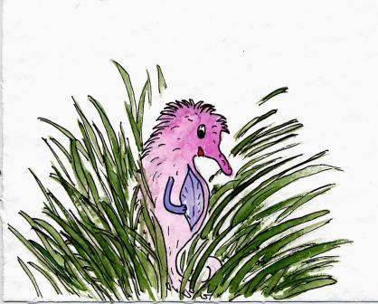 Es war gar nicht so einfach, jemanden zu finden. Es war noch früh am Morgen und kaum jemand war wach. Da entdeckte Quaddl in der Nähe eines großen Seegrasfeldes etwas rosafarbenes, flinkes vorbei schwimmen.