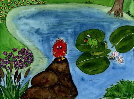 Quaddl lief in Richtung Licht und freute sich, als er endlich wieder richtig sehen konnte. Da entdeckte Quaddl einen hohen Stein. Er kletterte hoch und sah sich um. Jetzt wusste er dass er den richtigen Teich gefunden hatte, denn der ganze Teich war mit Seerosen bedeckt.