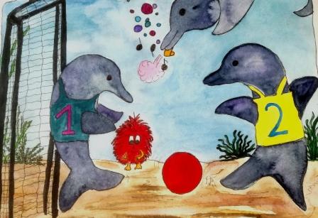 „Du bist rund und rot. Du siehst genau aus wie unser Ball. Vor allem bist du auf unserem Spielfeld“, sagte eine andere, nette Stimme, die zu einem Delphin gehörte.