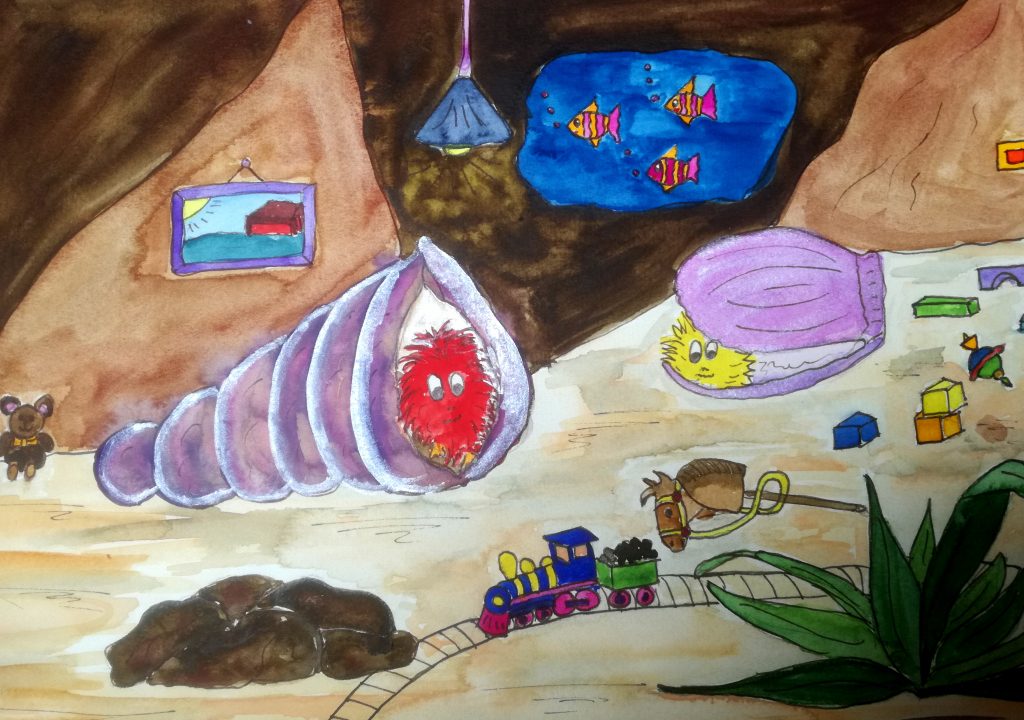 „Hey du Schlafmütze, bist du jetzt endlich wach? Es geht bald los!“, Quiddl, die quietschgelbe Muschelwuschel-Schwester von Quaddl, wirbelte in die Schlafhöhle der beiden.