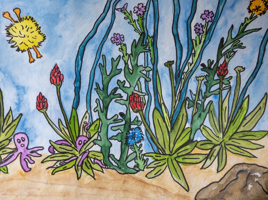 Gesagt, getan. Die beiden schwammen zu den Blumen und wollten eine abbrechen. Aber das war gar nicht so einfach, denn die Stängel waren sehr dick und fest.